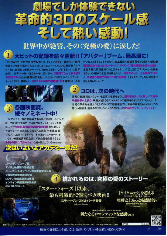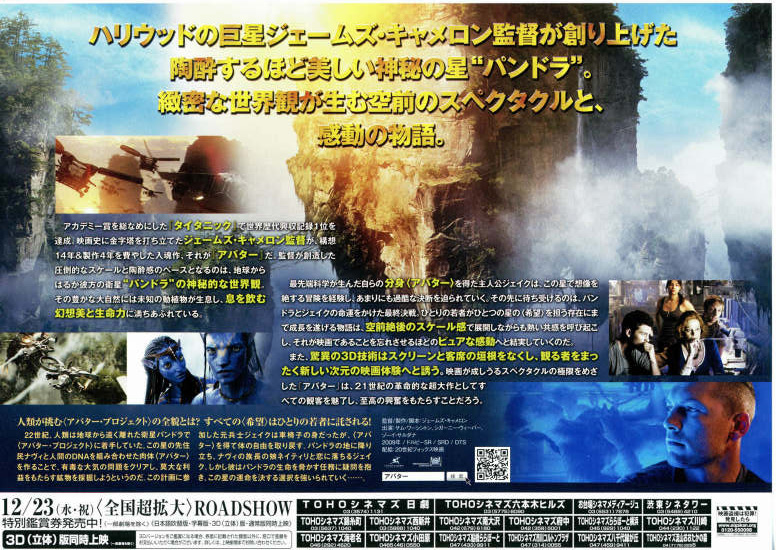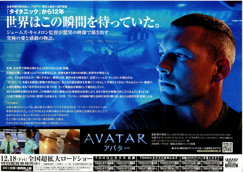 遅まきながら、今日「アバター」を観てきました。末娘も一緒だったので、3Dの吹き替え版にしました。とてもよかったですね。巷では3Dが話題になっていますが、3Dなんて表面的なことではなくてきちんと内容で勝負してくれています。遠隔操縦でアバターを動かすという発想も面白いですが、一番感じたことは、相手を知り話し合うことの大切さ、力まかせで争うことの哀しみと無意味さ、偏見をベースとした驕りの危うさと愚かさ、ということでした。大切なことは、相手を思う心と、平和的な問題解決。そして愛する人たちを守る強さ。お互いを尊重し、エゴを捨て、きちんと話し合いができれば人々はもっと幸せに暮らせるんだろうなと考えずにはいられませんでした。このストーリは、2Dでも充分伝わるすばらしいテーマです。もちろん、3D自体は自然な奥行きに仕上げられていて、画面にリアルさと迫力を加えていることは間違いありませんけど。