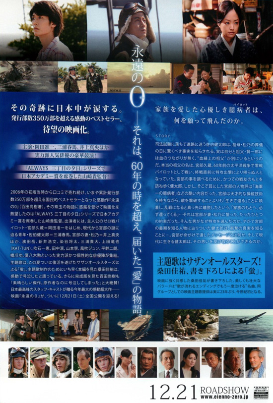 | 年末の大掃除や片づけが一段落した今日、家族で「永遠の0」を観てきました。人気映画ではありますが、さすがに大晦日の夕方の上映では、お客さんもガラガラでゆっくりと静かな雰囲気で楽しむことができました。「永遠の0」は小説を読んでストーリはわかっているにもかかわらず、涙無くしては観ることができませんでした。最初の松乃の葬儀での賢一郎が悲しみに崩れ落ちるシーンからもう泣いてしまいました。祖父の話をしてくれる戦友の話にもひとつひとつ感動があり、それぞれでジーンときます。宮部久蔵自身は戻ってきませんでしたが、いろんな人の心の中に宮部久蔵を残してきた、そういう生き方をしたいと思いますが、もう私の年では遅いですね。こういう映画には感動しても、戦争をきちんと理解できているかというと、私を含めて今の日本人はきちんと理解ができていないと思います。時代が悪かったとか、大本営が悪かったとか、教育やマスコミが悪かったとかいいますが、すべての普通の人たちが、人や命を大切にし愛する心を宮部久蔵のようにもっと強く語ることができれば、あの戦争はもっと違ったものになったかも知れません。また、それが出来なかったという普通の人間の弱さもきちんと理解しないといけません。余談ですが、身体に障害を受けた復員兵(傷痍軍人)は定職につくのが難しく、私が子どもの頃にも神社などで物乞いをするそういう人たちの姿があったことを覚えています。万歳で送り出した人たちなのに、傷ついた人たちへの偏見や差別。世の中の目は刻々変わる危ういものであり、どこを中心に考えるかで評価も変わるということを自覚し、自分の考え方の物差しはできるかぎり不変のものであろうと思いますが、なかなか難しいのが現状です。 |