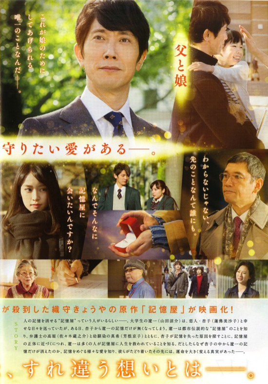 | 今日は「記憶屋 あなたを忘れない」を鑑賞。生きていくのに辛すぎる記憶を消してくれる記憶屋がいたなら、私も子どもたちが受けたいじめの記憶を消してあげたいと、そういう思いで感情が入ってしまい、最後の高原弁護士の手紙のあたりでは涙が止まらなかったです。テーマとしてはとてもいい映画だと思います。映画の作りとしては、七海の記憶を消したことと、ラストシーンの遼一と真希の会話は、ちょっとチグハグ感を受けてしまいました。ちなみに、この映画の主題歌は中島みゆきの「時代」です。 |