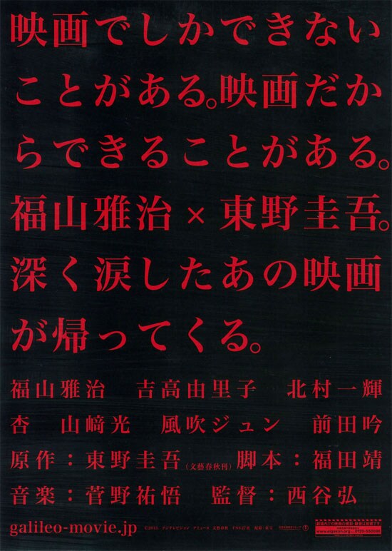 湯川学:福山雅治 / 岸谷美砂:吉高由里子 / 草薙俊平:北村一輝 / 川畑成実:杏