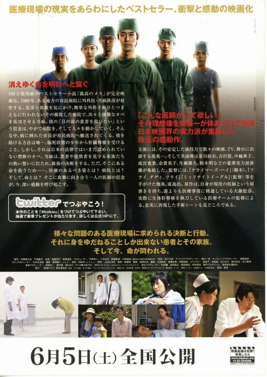 | 横浜に無事に行ってきてほっとしている今日は、借りていた「孤高のメス」を観ました。もともと医療ドラマが好きな私ですが、この作品も泣けるシーンが多くてとても良かったです。堤真一も好きですし、夏川結衣も好きなので、より感情移入できたのかもしれません。欲をいえば、大学を患者第一に立て直す出来事もあればより良かったと思いますが、2時間という中では、肝臓移植という出来事がメインになっているのは仕方がないのかもしれません。また、物語は亡くなった中村看護師の日記を医者になった息子が読むという形で進みますので、看護師視点になっています。中村看護師が当麻先生と別れるシーン、息子が当麻先生が院長であろう病院で働くことになったシーンが、ラストを飾るいいシーンでしっかりと泣いてしまいました。感動と笑いもあるいい映画でした。ただ、16歳の少年の肝臓を、年取った人間に移植することに対しては最後まで気になりましたし、故人の意思を尊重するのならば他の臓器ももっと役立ててあげられればという思いも持ちました。違法ギリギリなので、同じ病院内でやれる範囲で行うしかなかったのかもしれませんが、もっと先ある若い人への広い移植としてほしかったなぁと思いました。 |
