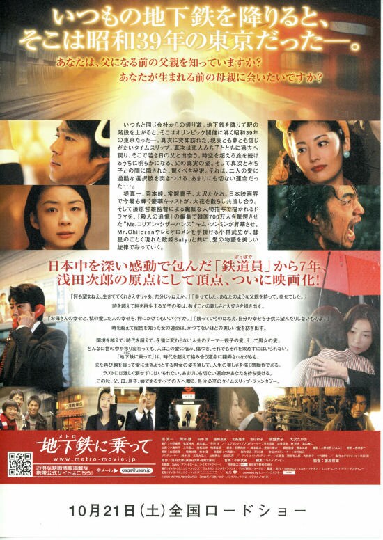 | 今日は、浅田次郎原作の「地下鉄(メトロ)に乗って」を観ました。古い映画なので一度はテレビかビデオで観た記憶はあるのですが、改めて観てもまったく思い出しませんでした。今落ち込んでいる原因が、自分は子供への愛情が足りないのかもという自己嫌悪からきているので、この映画はいろいろと心に突き刺さりました。父親というものは、自分の本心や子供への愛情をうまく表現できずに、子供との間に大きな溝を作ってしまうことが少なくありません。この映画では、真次が地下鉄を通して過去の父親と出会い、その生き方や本心を知って父親を理解していくというストーリーですが、現実はそういうこともなく、溝を残したまま今生の別れが来るということがほとんどだと思います。ただ私の場合は、子供が過去の私に会って心の中を知ろうとしても、この映画のように子供への愛情を示せる時期というものがないのではと思ってしまいます。それほど私は、子供を何よりも愛していたという行動をとれていたか自信がないからです。真次が、父親の家族に対する思いや兄の死に悲しむ姿を知っていくたびに感動して涙する私でしたが、顧みて自分はそういう父親ではなかったと思うと、より落ち込んでしまいました。そういうことを考えさせてくれるということでは、この映画はよく作られていてとても良かったと思います。最後に真次とみち子の本当の関係がわかるのですが、私は「みち子は最初からどこまで知っていて真次とあのような関係になったのかということ(ラストシーンではすでに悟っていた)」、「みち子が真次のことを思うがために自分の存在を消す行動をとったこと」は、どうしても私は共感できるものではなく、その思いがそれまでの感動を台無しにしてしまって、私にとってはモヤモヤ感の残る結果となってしまいました。(人によってはその行動も感動なのかもしれませんが・・・) |