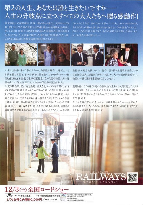 | 順番は公開順ではありませんでしたが、これで「RAILWAYS」3作をすべて観終わりました。結果的には、この2作目が私には一番良かったです。男は妻を自分の人生の一部であり持ち物のように思ってしまいますが、そうではないことをこの10年以上前の映画であらためて教えてくれます。自分の思い通りでなければ「出て行け」とすぐに言ってしまう男連中。徹がしみじみ言っていた「ひとつのことをやりとげるのに精いっぱいだった。しかし、それだけじゃダメなんだ。それを今思い知らされた」という言葉。男は「自分が敵の多い世界で戦っている、だから自分を助けるのが当たり前」みたいなプライドや驕りがあるのでしょうね。夫の人生も妻の人生も子どもの人生も、すべて本人のもの。家族が助け合うのは当たり前ですが、それぞれの人生を尊重するのも当たり前。そんなことをこの映画であらためて考えさせられました。徹がすべてを理解して、離婚届を出して結婚指輪を捨てるシーンがありましたが、これも妻の心情をしらない自分勝手な行動と一瞬思いましたが、いやいやこれは新しい人生を二人で歩むあらたな出発点なのだろうな、あらためて結婚を申し込むのだろうなと読み解くことができましたが、それは物語としては美しく感動的なのですが、そこは私の年齢になっていろいろと知ると年金や相続のなどのことを考えると大丈夫かなという現実的な心配をしてしまいました。相手の話をよく聞く、相手の立場になって考える、それが大事ですね。涙が止まらないという映画ではありませんが、最初から最後までいろいろと考えさせてくれるとても良い映画でした。 |
