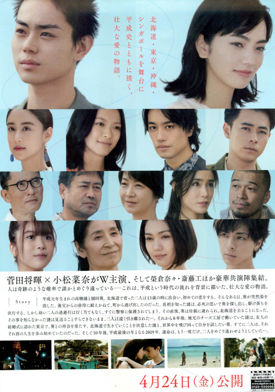 | 中島みゆきの「糸」をモチーフにした映画と言うことで観てみましたが、複雑でモヤモヤした思いで観終わりました。少し心に響いたのは漣と香の最後の病室の場面だけで、その他はどうもしっくりときませんでした。漣と葵はわざわざ気持ちをすれ違わせている感じがして、そのすれ違いやそれぞれの人生がどうしても避けられないものであったのか、ふたりが素直に幼い頃の気持を伝えていればそれでよかったのではないかと、そんな思いが捨てきれませんでした。お互いが別の女性、男性と結びつき、特に香の存在や思いを考えれば、ずっとお互いを思い続けていたという設定は、ちょっと映画としては素直に受け入れがたいところもあります。中島みゆきの「糸」をモチーフにしたとは思いたくない映画でした。お互い結ばれていた糸が、もっと切なくて悲しくてどうしようもない理由で離れてもつれて、そして最後にお互いの糸を手繰り合うという、そういうストーリーにしてほしかったと思います。ちなみにこの映画は、菅田将暉と小松菜奈が正式な交際をスタートしたきっかけの映画だそうで、結婚式もこの映画の舞台だった函館で挙げられたそうです。 |