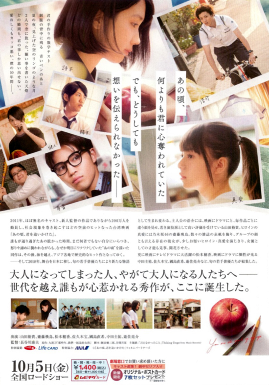 | 今年、102作目の映画鑑賞。この映画は2011年公開の台湾映画のリメイク版です。山田裕貴と松本穂香の名前で選んで観てみましたが、齋藤飛鳥の可愛らしさの魅力にはまってしまう映像でした。映画としては、とても心地よく観ることができてとても良かったと思います。恋愛ものの学園映画はあまり観ないのですが、この映画はチャラ付いたところは無くて青春がとても眩しく感じる映画でした。浩介と真愛の恋は、浩介の純粋さと真愛の複雑ながら一途の気持が、お互い直接伝えることに躊躇いを感じることからすれ違うという、「若い頃はそういうことがあるかもなぁ」と思える関係でした。なので、お互いの行動にイラついたり落胆したりすることもなく、若い頃を思い出しながら素直にみることができました。ただ、浩介、真愛、まわりの友人たちのお互いを思う友情の絆は、私にはとても眩しく感じてしまいました。私の若い頃は今以上に、恋愛などが思うように進まなかったら感情を抑えきれず変な態度をとってしまったり、恋人や友人の恋愛や楽しさを素直に喜べなかったりと、自分本位のじつに嫌な人間でした。なので、彼らの相手を思いやれる関係はとても眩しく羨ましく感じてしまいました。自分の青春時代がいかに暗くて自信のない劣等感の塊で屈折していたかということを思い出してしまいました。それほどこの映画は、爽やかで青春らしくて、とても眩しく羨ましかったです。オープニングでは浩介の結婚式かと思わせるところからスタートしましたが、最終的にはふたりの恋は残念な結果だったわけですが、浩介が昔のままの浩介であって、哀しさやモヤモヤ感やジメジメ感などまったく無く、その青春時代の恋愛を前向きに小説で描こうとするところで、この映画のタイトルに通じる終わり方をするわけで、とても安心する終わり方でした。とても良い映画だったと思います。 |