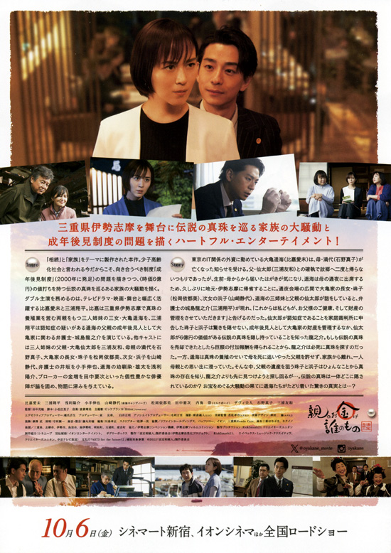 | この映画は、成年後見人の話であることと、舞台が三重県ということで、ちょっと観ておこうという気持ちになって観ました。成年後見人と言うのは、認知症や知的障害によって判断能力が不十分な人に代わって法的に財産の管理などをおこなう人のことを言います。証券会社の担当の人と話をしていた時に、私が認知症になって判断できなくなったら、私の財産を処分したりするための成年後見人としての弁護士などを裁判所で任命してもらう必要があると言われたから気になっていました。しかもその成年後見人には、月に何万円もの費用を払う必要があるとのことでした。成年後見人が私が死ぬまで財産を管理するので、その間は私も家族も私の財産を使うことや処分したりすることができないらしいのです。そういう厄介な話を聞いていたので、この映画の題材がとても気になっていました。そういう思いで観た結果は・・・、この映画の成年後見人である弁護士は悪徳すぎて極端すぎて、現実問題の参考にはなりませんでした。ストーリーも、成年後見人の問題を扱うというよりも、成年後見人と家族が隠された資産の6億円の真珠を探すというドタバタ喜劇的なもので、正直期待していた感じではありませんでした。舞台で踊りだしたり、急に妹に優しくなったり、老人施設の遊びではしゃいだり、キャラクター設定も振れていましたし、伊勢志摩舞台なのに伊勢弁もまったく出てこないし、私的には期待外れの所の多かった映画でした。コメディー映画として観るならばそれなりに楽しめるとは思いますが。 |