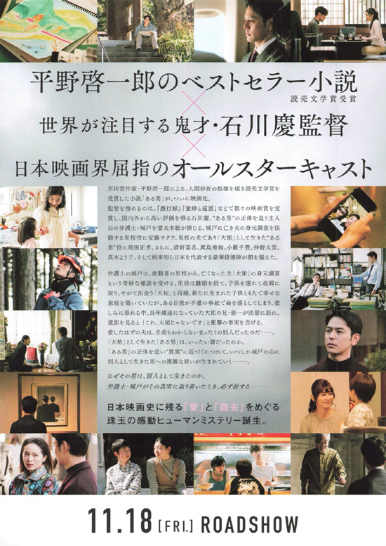 | 準新作が100円でレンタルできたので、比較的新しい映画をDVDで観ました。この映画はどうして選んだのかという理由が明確に思い出せないのですが、準新作の中で「愛したはずの夫は、まったくの別人でした」というキャッチフレーズで興味があって選んだような気がします。結果的には、この映画はとても良かったです。観た時はそのキャッチフレーズも忘れていたので、先入観はまったく無い状態で観始めたのですが、展開やカット割りのテンポが良くてぐいぐいと引き込まれていく感じでした。観る者を置いてけぼりにさせずにさりげなく丁寧な説明が織り込まれているのもストレス無く観ることができました。この映画で考えさせられることは、人に対する偏見と差別。それがあるために、普通に生きたくても生きられない。だから戸籍を変えて新しい人生を生きてみたいと思う。そういう行為を頭ごなしに悪いことだとは言えない重みがあります。自分は日常生活でそんな偏見や差別を持っていないか、それによって誰かを生きづらくさせていないか、そんなことをこの映画で自分を含めてみんなが考えられればいいなと感じました。妻夫木聡、安藤サクラ、窪田正孝、すべてとても良かったです。真木よう子がとても妖艶な感じがしていました。最後の真実をそうだったのねと思わせてくれる納得感がありました。ラストシーンは、差別と裏切りで傷ついた城戸が次の「ある男」となっているところで終わりますが、「あなたは自分の戸籍のままで十分新しい人生を送れるのじゃないか」と問うてみたかったです。誰もが偏見や差別なく、本来の自分を生きていける世の中にしたいものです。 |