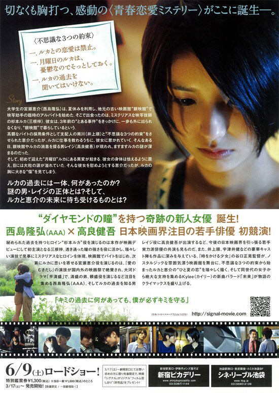 | 古い昔ながらの映画館を舞台にストーカーのような男のために祖父を死なせてしまった後悔で閉じこもりとなった女性・ルカの心を解きほぐしていくという、心温まるストーリーの映画でした。ルカは、心閉じた状態と恵介によって心開いていく過程が可愛くて切なくてとても素敵でした。恵介は人を思う優しい性格がよく伝わってきて、とても良いヤツでした。どこで泣いたかわからないほど、随所で泣いてしまいました。レイジは自分が傷つくことが怖いために相手に異常に執着する男ですが、ルカの言葉によって去っていったということは心の底まで腐った奴ではなかったようなので、そこはルカの今後も考えると救いでした。ルカを演じた三根梓という女優さんも恵介を演じた西島隆弘もよく知りませんでしたが、とても良かったと思いました。 |