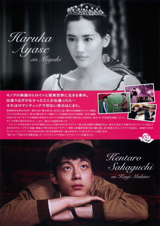 | この映画は以前にテレビで観たことがあって、その時にいい映画だなぁと思った記憶はあるのですが、細部はまったく覚えていないので今回改めて観てみました。結末さえ覚えていなかったこともわかり、適当に観ていたらその時に流れてしまうのだということを痛感しました。そういう意味では、このように感想を少しでも思い出して書いておくと記憶にとどめられるのではと思います。あらためて観て、やっぱりこの映画は安心して見ることのできるラブロマンス映画だったと感じました。登場人物に嫌な人もおらず、美雪と健司の双方の思いだけを純粋に楽しむことができました。お互いの気持ちを素直に話すシーンではジーンとして目が潤んできてしまいます。映画から女優ではなくその映画のヒロインが飛び出すというあり得ない設定なのですが、だからこそある制限の中で寄り添うという切ない愛情が生きてきます。最後は映画の中の物語の中で、懐かしい人々と一緒に幸せになってほしいなと思わせてくれる映画でした。本多の「映画なんてはかないもの。記憶に残る映画なんて一握り」という台詞がありましたが、そんなことないんじゃないかなと思いました。綾瀬はるかの魅力とともに、とてもいい映画だったと再認識できました。 |
