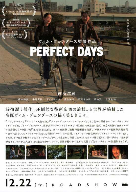 DAYS」、公開前から観たいと思っていた映画です。トイレ清掃員である平山の朝から夜までの日々を台詞もほとんどなく淡々と描いています。朝は道を竹ぼうきで掃除する音で目覚めて、歯を磨き、植物に水を与えて仕事に出ます。黙々とトイレを丁寧に念入りに清掃し、見下すような態度をとる人たちに対しても静かに利用者優先で対応します。仕事が終われば、銭湯に行き、同じ店で飲んで食べて部屋に戻り、本を読んで寝ます。そんな日々を繰り返し描きます。しかもそれは仕方がなくではなくて、自分で選んだ生活のように感じられます。すべてが平山とは正反対の同僚のタカシ、その彼女のアヤ、そして姪のニコがその生活に絡んできて、その規則的で静かな生活を少し乱されますが、いつも穏やかな笑みを少し浮かべながら静かに対応していきます。タカシが仕事を辞めた時、妹と久しぶりに会った時、ラストシーン、そこだけいつもは見せない感情を出しますが、それ以外は、何か秘めた思いでもあるような静かで穏やかな日々です。そういう映像を見ていると、人の幸せとは何なのだろうと思ってしまいます。いつも規則的に自分の思う通り過ごせた日々が「PERFECT