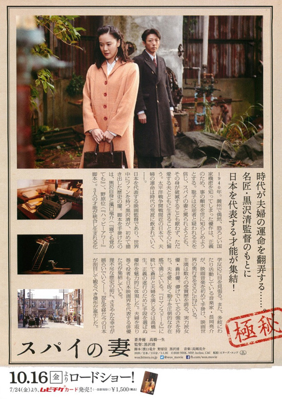| この映画はもともとNHKのドラマとして製作されたもので、それをスクリーンサイズや色調を見直して劇場版として公開された映画です。スパイの妻ということですが、夫の優作は厳密にはスパイではなく、満州で知った日本軍の恐ろしい国家機密を世界に訴えようとする男という設定です。なので、金銭で日本を裏切るスパイということではなく、たとえ日本のマイナスになったとしても自分の信念に従って正しいことを行うという正義感のある男です。その設定は理解できるからこそ、タイトルに”スパイ”という言葉を使っていることに違和感を感じました。日本国家に逆らうという意味だけで使ったのか、それとも本当に日本国家を裏切るスパイだったのか、その意図はわかりませんが、観ている側の私としては、”スパイ”とタイトルで決めつけているような気がして、優作のキャラクターを邪魔していました。それと、結局国家機密はどう扱われてどう歴史に影響したのか、そこがわかり難い描き方だったので、この夫婦の命がけの正義の行動が結局何だったのかと無意味にも感じてしまいました。聡子は優作の奇策によって結局巻き込まれることなく終戦を迎えることになるのですが、それが優作の優しさだったのか、ただ聡子が任務に邪魔だったのか、そこもどちらにも受け取ることができて、モヤモヤ感が残ります。聡子の多くの行動や言動が、夫への愛と言うよりも、感情に流された軽率な行動にも感じられたので、余計にそう思いました。さらにラストシーンで、空襲のあとの海岸で泣き叫ぶ姿も、そこまでの流れからなぜそういう行動になるのかわからず、聡子の心情をよくくみ取れませんでした。描こうとすることがまったくわからないというほどではないのですが、大きなモヤモヤ感の残る映画でした。 |