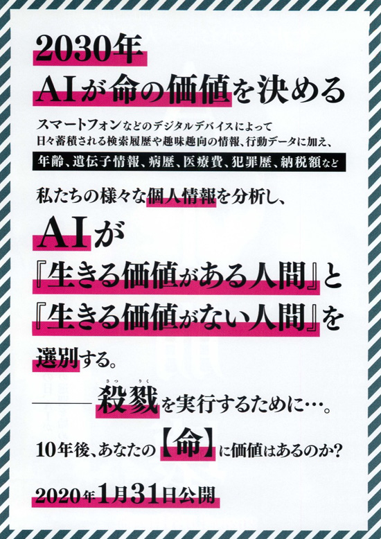 | この映画は微妙でした。偶然なのか2023年12月からスタートして、2030年の世界を描いているのですが、AIの発展度合いと社会と人間の発展度合いが釣り合っていないというか、AIというものが中途半端な理解で製作されているというか、最初から最後まで中途半端な感じを拭えない映画でした。この映画で伝えたいことはわからないでもないですが、もう少し専門家による監修をしっかりとしないと、AIはある意味危険なものという印象を与えるだけかなと思います。AIは膨大な情報の中から目的の情報を瞬時に探し出す能力は人間をはるかに上回ります。そのことと、意思をもってAIが自立するということは、また別の問題と私は思います。探し出した情報を人間的なインターフェースで会話的に人間に伝えることと、意思を持って情報を操作するということは、技術的に大きな違いがあると思っているからです。AIに依存する社会は好ましくありませんし、最終判断は人間が行うべきですし、そういう教訓は重要ですが、映画としてはそんな中途半端さや細部の設定の不自然さが目立ち、重さや現実感を感じない映画でした。感動や涙もまったくありませんでした。 |