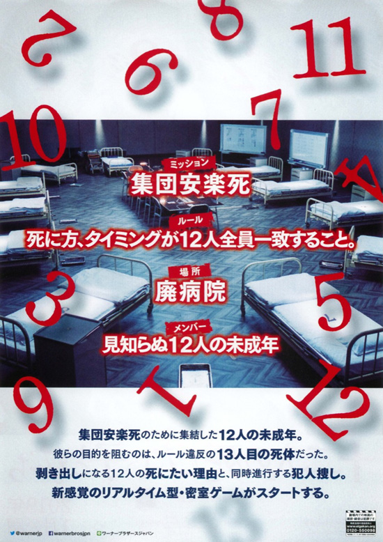 | この映画はずっと観たいと思っていた映画で、やっと観ることができました。私は何の前知識も無くて、死にたい人間が集まって一人ひとり死んでいく殺伐とした物語かなと思っていたのですが、まったく違いました。死にたい人間を集めて話をしあったり関係を深めたりしながら、最後には生きるということを選択するという物語でした。ただ、単に話し合うということではなく、12人だけではなくもう一人いるということから、それが誰なのか、誰が連れてきたのかということで、犯人捜しの推理が展開されていきます。12人の時系列的な動きを明確にしていくことで真実が見えてくるのですが、その解き明かしはけっこう面白かったです。エンドロールの時に時系列的に12人の行動が流れるのは、ああそうだったのかとおさらいになって良かったです。本当に死にたいと思っている子どもたちが、現実的には、このやりとりや出来事だけで前向きに生きる考えになるとは思えないところはありますが、いろいろ悩んで死にたいと思っている人には観てほしいと思いました。 |