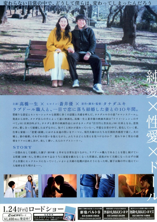| 「スパイの妻」での夫婦役だった高橋一生と蒼井優がその前に夫婦役をしていた作品というので観てみました。気になる点はあったものの、全体的には楽しめる作品でした。特に蒼井優のベッドシーンとか、蒼井優そっくりのラブドール製作とか、なかなか観ていてドキドキするものがあります。蒼井優は、可愛らしくて純粋で清楚な感じを失わずに、スケベな妻(哲雄談)を違和感なく演じてしまうのですから、素晴らしい女優さんだと思います。高橋一生の真面目で朴訥なところもとてもいい味が出ていました。内容は、哲雄と園子のちょっとした嘘と夫婦愛、そしてラブドール製作に挑む姿の二面性がありますが、最後は、園子の運命によって夫婦で最高のラブドールを作り上げるという物語です。真面目なシーンとふざけたシーンが絶妙に絡んでいて、園子の運命に対して悲しいとか切ないとかという気持ちはあまり感じずに、清々しい気持ちで観終わることができました。そのために、園子の無くなるシーンや哲雄の悲しむシーンは無かったのかなと感じました。気になるところは、哲雄が園子の希望であり追悼の意味があったとはいえ、妻と同じ顔と体のラブドールを妻の名前で販売することに躊躇いは無かったのだろうかという点でした。哲雄を自分に置き換えると、とても耐えられないような気持ちを感じてしまいました。それと、園子の闘病のシーンは、健康ならば気にならなかったと思いますが、今の私にはちょっときついなぁと思ってしまいました。この映画は、ちょっと変わった夫婦愛を感じられて、私にはとてもいい映画でした。 |