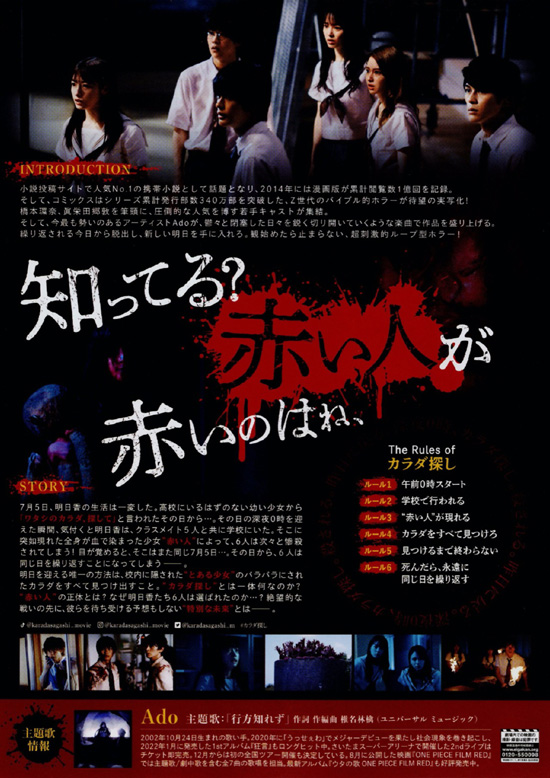 | 怖い映画は好んで観ませんが、この映画は面白そうと思ってしまってDVDを借りてきてしまいました。いつも映画は深夜に観るので、覚悟をして深夜に観始めたのですが、カラダ探しに選ばれた6人はあっけなく死んでしまって、その日の朝に時間が戻ってその日の6人の学園生活が普通の学園ドラマのように明るく描かれるということの繰り返しなので、怖さは継続せずにストーリーの面白さに引き込まれていってしまいました。8個にバラバラにされた死体を見つけないと終わらない夜の繰り返しが、だんだんと6人の心が近づいてレベルアップしていく過程がとても面白かったです。この映画の原作は4部構成でなりたっているそうなのですが、この映画ではその第1部という形になっているようです。それぞれで、カラダ探しを依頼する側と頼まれる側が異なり、今回の頼まれた側の森崎明日香が、最後に生き残ったことにより第2部では頼む側になるようです。この映画のラストで、バラバラ殺人事件の新聞報道の被害者が森崎明日香に変化する不気味なシーンで終わるのは、そういう次の物語への布石なので続編があるのかもしれません。橋本環奈はちょっと大げさな台詞の言い方が気になる俳優なのですが、今回は寡黙でおとなしい役柄だったので、とても良かったと思います。ちょっと不気味ではありましたが、とても楽しめる映画でした。 |