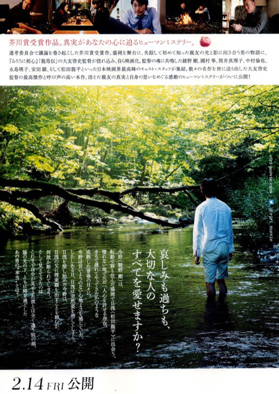 | 難しい映画でした。”失って初めて知る本当の姿”ということで、そのギャップに興味があったのですが、思っていたほどギャップを感じませんでした。秋一の知る典博自体がまじめな感じではないし、生き方にもいいかげんなところがあり、本当の姿のその域からあまり変わりがありません。典博の影や裏よりも、典博を愛してしまう秋一や、秋一と和哉との関係などの方が影や裏を感じました。そもそも人間は人に知られたくない影や裏はあるものです。それをクローズアップするには、ちょっと弱い設定なのかなと私は感じてしまいました。ちょっと期待外れで面白くない映画でした。 |