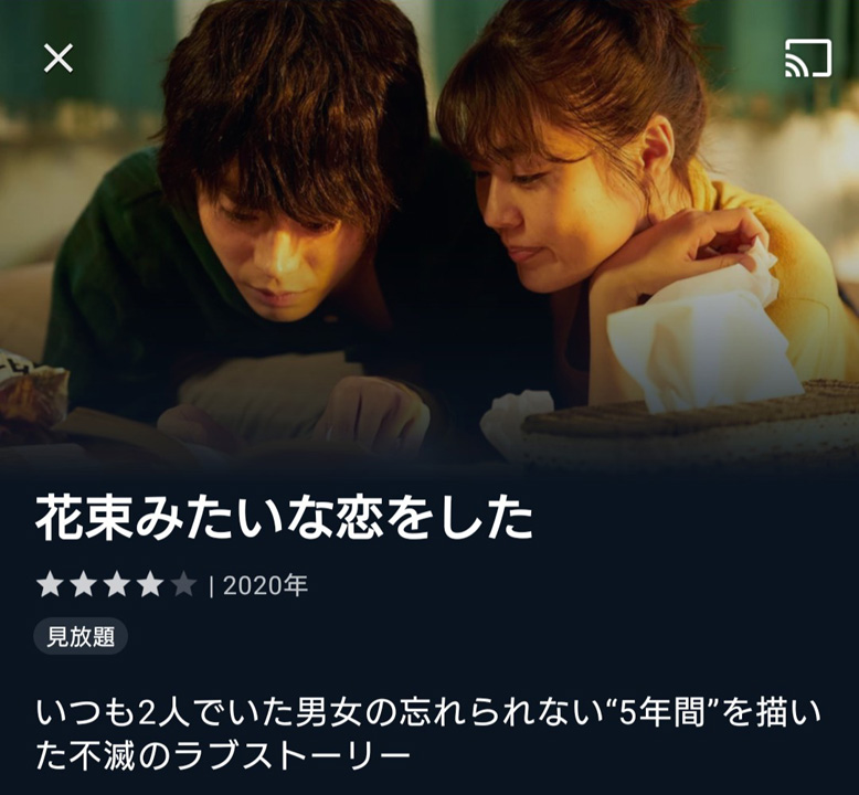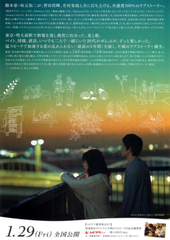 | 理想の二人が奇跡のように出逢い楽しい時間を過ごすものの、男は生活のために社会に出て相手に対する愛情の形を勘違いして別れてしまうというストーリーです。それはありがちなことで、金銭や社会的立場の確立を優先することが相手のためになると思い込んでしまったり、そういうことに疲れ果ててしまったりして、本来の二人で楽しい時間を過ごすということを忘れてしまい疎かにしてしまうというのはよくあることで、それが現実と言うのも真理です。しかしこの二人は、そういう経験をしてもそれほど愛情や関係が壊れているようには見えません。それでも別れてしまったというのは少しきれいすぎる気がしますが、そういう決断をするのはなかなかできないことで本当は理想的な姿なのかもしれません。それは、二人が自分と相手を見つめ直すという意味で必要なことだったのかもしれません。だからこそラストは、奇跡的にストリートビューで二人が写っているのを見つけて驚き喜ぶ麦の姿で終わります。この物語の最初が、麦がストリートビューに写っているという奇跡があってから絹に出会ったことから、この最後のシーンで、この二人はまた良い関係に戻るのではと予感させてくれて微笑ましい気持ちにさせてくれるのです。花束のようなとても美しく理想的な恋人の関係を見たという映画であり、その恋人を菅田将暉と有村架純が演じていることが、よりこの映画を魅力的にしてくれていると思いました。 |