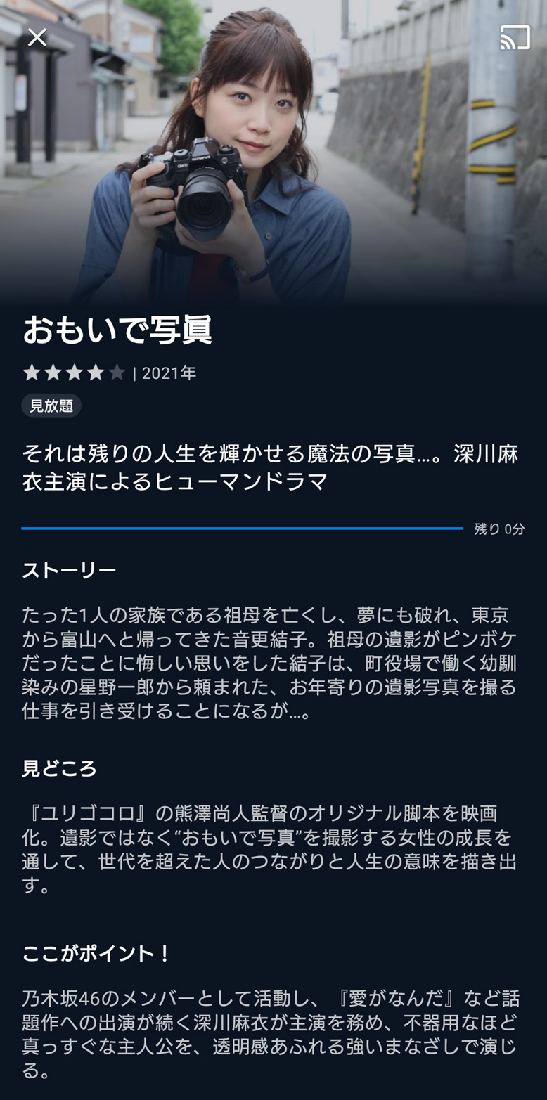 この映画は、私の好みの映画でした。みんな優しくて切なくて、結子の祖母に対する後悔を優しく包み込むシーンなど、他愛もない普通の会話のシーンで目頭が熱くなってジワリと涙が出てくるような映画でした。深川麻衣は、朝ドラの「まんぷく」の再放送で意識するようになった女優ですが、感情の揺れをとてもいい感じで表現していて、とても良かったです。