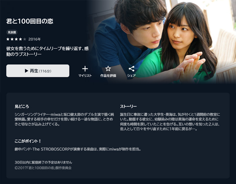 葵海の命を救うために、陸はその結果を変えようとして何度も過去に戻ることから、「君と100回目の恋」というタイトルになっています。陸がなんでも知っているように落ち着いた態度をとっていたことも、そのことがわかると腹に落ちます。陸を演じた坂口健太郎はそのあたりの複雑な心境をよく表現していたと思います。葵海を演じたシンガーソングライターのmiwaも明るい姿と悩む姿にメリハリがあり、とても良かったです。途中まではこの映画では泣くことはないだろうと思いながら観ていましたが、二人が覚悟を決めたあとのライブコンサートのシーンから涙が止まりませんでした。とてもいい映画でした。