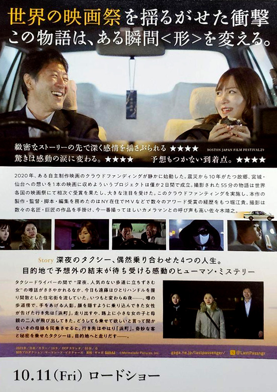 東日本大震災の10年後、タクシードライバーの遠藤は、突然車内に現れた同僚たけちゃんから、歩道に若い女性が立っており、車に乗せて目的地の浜町まで行くといなくなっているという話を聞きます。遠藤は一笑しますが、その夜噂の場所で若い女性を乗せることになります。行先は浜町。走りだすと車の前に母親とちいさな子供が飛び出します。その親子の行先も浜町。若い女性と親子を乗せて走りだそうとしますが、車が故障で動かなくなり、そこで、いろんなことがわかっていく・・・ |