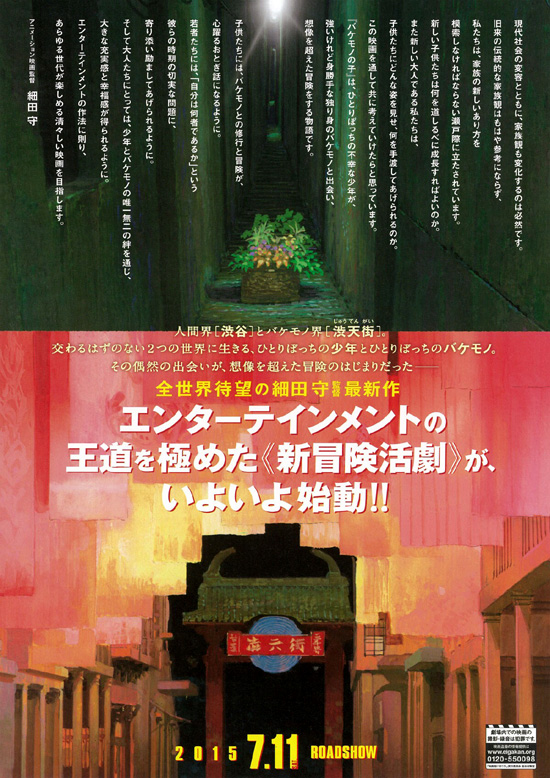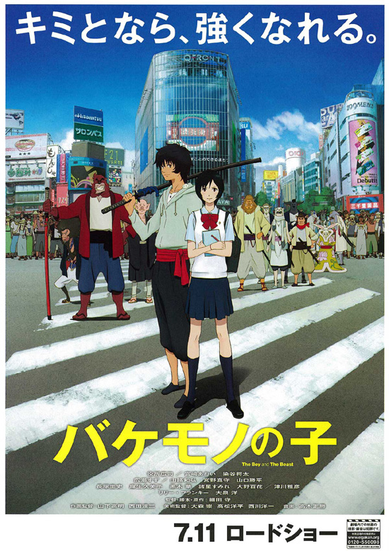 【あらすじ】 この世には人間の世界とは別にバケモノの世界があり、人間界の渋谷とバケモノ界の渋天街が通路によって結ばれています。両親が離婚し、父はどこにいるかわからず、母は死んでしまった少年・蓮はひとりで生きていますが、ある日、渋谷でバケモノと出会ってバケモノの世界に迷い込んでしまいます。バケモノの世界では渋天街の宗師が神に転生するということで、次の宗師選びにはいっています。候補のひとりである熊徹は、腕力はあるものの人望がなく弟子もいませんでしたが、名前を名乗らない蓮を九太と名付け自分の弟子とします。数年後、九太は人間界で楓と出会い、熊徹は宗師の座をかけて猪王山と闘うのですが・・・ |