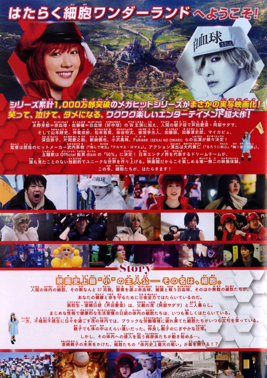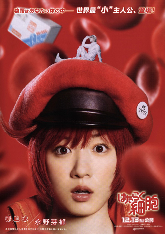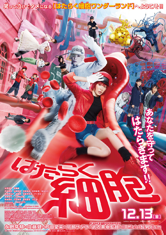 【あらすじ】 人の体内では37兆個もの細胞がそれぞれ役割を持ち、日夜その仕事をしています。真面目な女子高生・漆崎日胡(芦田愛菜)と、不摂生にもほどがある不健康な父親・漆崎茂(阿部サダヲ)の身体の中でも、その細胞たちが働いています。日胡の体の中では、赤血球(永野芽郁)や白血球(佐藤健)が日々精力的に働いています。一方、茂の身体の中は不摂生で過酷な環境になっており、細胞たちは愚痴をこぼしながら働いています。そんな時、日胡の身体に異常な白血球が誕生し、やがて体の中を支配し始め、正常な細胞と異常な細胞の戦いが始まる・・・ |