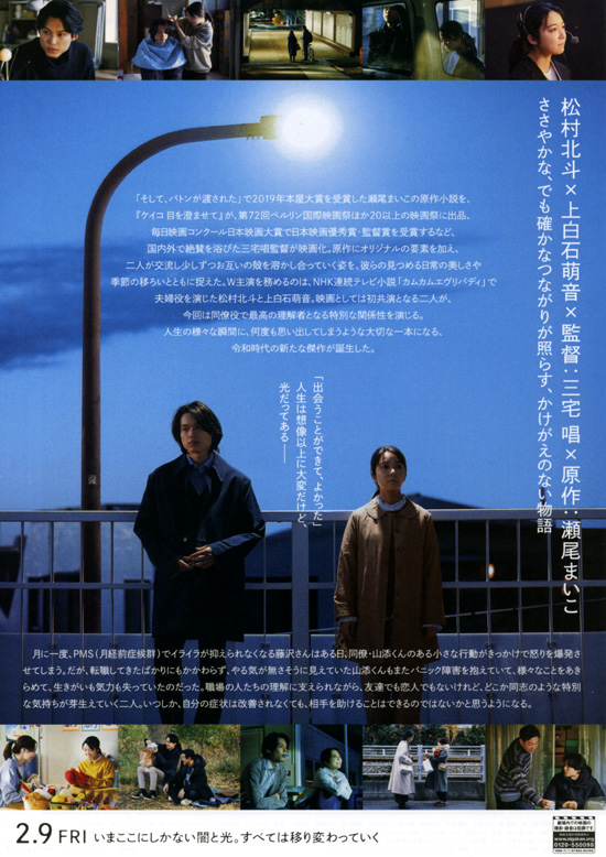 【あらすじ】 PMS(月経前症候群)のために月に一度苛立ちを抑えきれなくなる藤沢(上白石萌音)と、パニック障害で仕事や生きがいに気力を無くしている山添(松村北斗)の物語です。ふたりは、その病気のために働いていた職場を離れ、現在はプラネタリウムや顕微鏡などの教育キットを製作する栗田科学で働いています。理解ある社長や同僚の中で、二人はお互いの病気を理解し合い同志のような気持ちで支え合っていく・・・ |