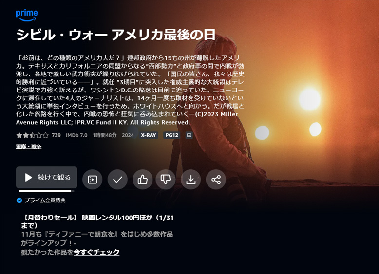 2024年の映画のランキングで「シビル・ウォー アメリカ最後の日」が上位にあがるので、Prime Videoで無料配信していたので観てみました。