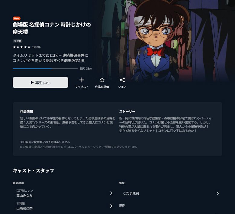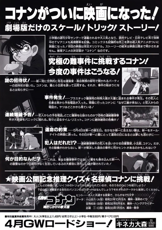 劇場版「名探偵コナン」の第1弾ですが、今の作品と遜色ない出来栄えに驚きました。もちろん、電車の動きなどアニメ技術として劣るかなというところはありますが、個々のキャラクターや事件の謎解きなどの質はまったく古さを感じさせず、とても面白い作品でした。