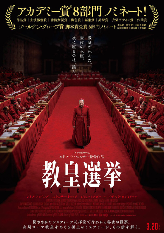ある日、カトリック教会のトップにしてバチカン市国の国家元首であるローマ教皇が、心臓発作のため突如として急死してしまう。教皇死去の悲しみに暮れる暇もなく、イギリス出身でローマ教皇庁首席枢機卿を務めるトマス・ローレンス枢機卿は枢機卿団を招集し、次のローマ教皇を選出する教皇選挙(コンクラーヴェ)を執行することとなった。100人以上の枢機卿がコンクラーヴェが行われるシスティーナ礼拝堂に集まる中、有力候補者として、アメリカ出身でバチカン教区所属、リベラル派最先鋒のベリーニ枢機卿、カナダ・モントリオール教区所属、穏健保守派のトランブレ枢機卿、ナイジェリア教区所属、初のアフリカ系教皇の座を狙うアデイエミ枢機卿、イタリア・ベネチア教区所属、保守派にして伝統主義者のテデスコ枢機卿の4人の名が取り沙汰される中、メキシコ出身で昨年に前教皇によって新たに任命されたばかりのアフガニスタン・カブール教区のベニテス枢機卿が開始直前に到着する。かくしてコンクラーヴェが始まるが、枢機卿団の票が割れていく水面下では陰謀や差別、スキャンダルの数々が犇めいていた。裏で信仰に関する悩みを抱えるローレンスはそれらに苦悩を深めつつもコンクラーヴェを執行していくが、新教皇選出を目前とする中、厳戒態勢が敷かれたバチカンを揺るがす大事件が勃発する・・・ |