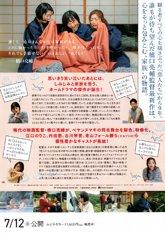 三姉妹の長女・弥生(江口のりこ)は美人な妹たちにコンプレックスを抱き、次女の愛美(内田慈)は優等生の姉との比較を恨み、三女の清美(古川琴音)は姉たちを冷めた目で見ていた。彼女たちは共通して母親のような人生を送りたくないと思っていた。三姉妹は親孝行で母親を温泉旅行に連れ出すが・・・ |
