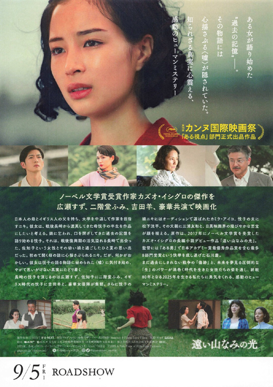 第2次大戦後の1982年。日本人の母と英国人の父を持つニキ(カミラ・アイコ)は、大学を中退して作家を目指していた。執筆のため、異父姉の死から足が遠のいていた実家を訪ねた彼女は、長崎で原爆を経験した母の悦子(吉田羊)と数日間を共にする。ニキは、長崎で原爆を経験し戦後イギリスへ渡った母の半生を作品にしたいと考えて、母に当時(1952年)の話を聞かせてほしいと要望する。口を閉ざしてきた母は過去の記憶を語り始めるのだが、その話にはある嘘があった・・・ |