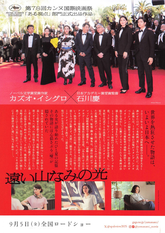 2017年ノーベル文学賞作家「カズオ・イシグロ」の1982年発表の長編小説デビュー作品の映画化作品です。観たいけどどうしようかなと思っていた時に、長女から「これはお父さんの好みからすると観に行くんでしょ」と言われたことが後押しとなったので、ひとりで観てきました。