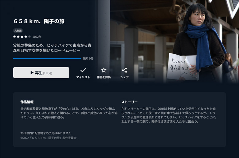 青森県弘前市出身、42歳の在宅フリーター、陽子(菊地凛子)は20年以上連絡を絶っていた父(オダギリジョー)の訃報を受ける。従兄の茂(竹原ピストル)の家族と車で向かうことにしたが、途中のサービスエリアで置き去りにされてしまう。出棺を明日に控え所持金のない陽子は故郷までヒッチハイクを試みる・・・ |