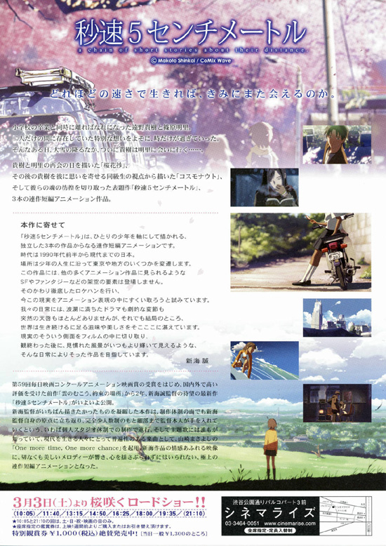 「桜花抄」、「コスモナウト」、「秒速5センチメートル」という短編3話の連作構成。