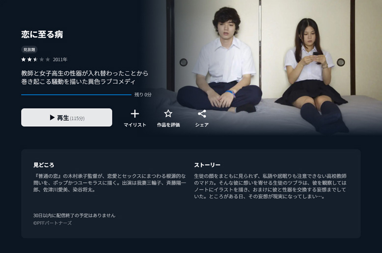 10月29日に観た今年公開の「恋に至る病」の映画情報を確認していた時に、同じタイトルのこの映画のことを知りました。染谷将太と佐津川愛美が出演しているということで、ちょっと興味を持ったので、10月30日の夜にU-NEXTで観てみました。