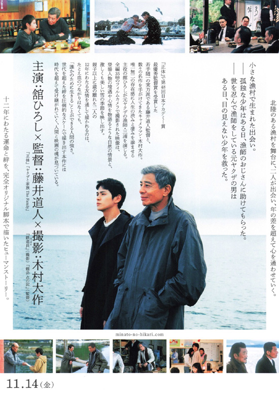 漁師として細々と生活する元ヤクザの三浦(舘ひろし)は、白い杖をついて歩く少年の幸太(尾上眞秀)を見かける。両親をヤクザ絡みの交通事故で亡くした幸太は、彼を引き取った叔母・美和子(MEGUMI)やその交際相手からも虐待を受けていた。孤独な幸太にどこか自身の姿を重ねた三浦は、自身の船に幸太を誘う。どこにも居場所がなかった者同士、2人は年の差を超えた特別な友情を築いていく。幸太に視力回復の手術を受けさせるため、ヤクザから金を奪った三浦は、幸太に一通の手紙を残して自首する。12年後、突如として行方がわからなくなった三浦を捜していくうちに、幸太(眞栄田郷敦)はある秘密を知る・・・ |