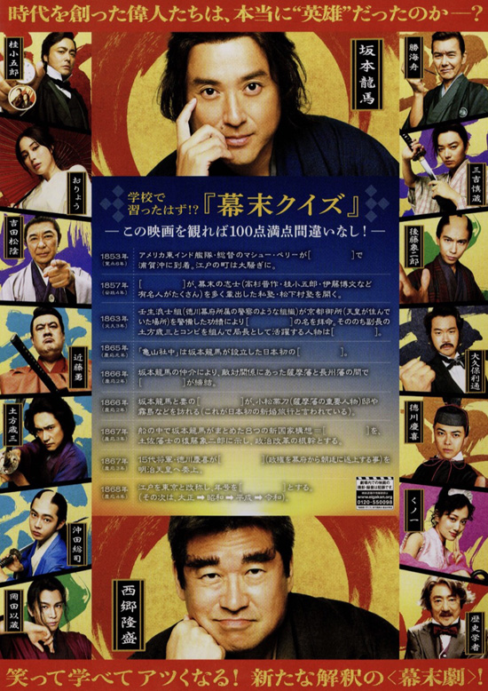 最初は歴史など関係なくドタバタハチャメチャな映画かと思ってしまいましたが、エピソードを重ねていくとけっこう歴史を真面目に見ていて、本当はこうかもしれない、龍馬はこんなチャラ男だったかもしれない、と思ってしまうほど変な説得力がありました。