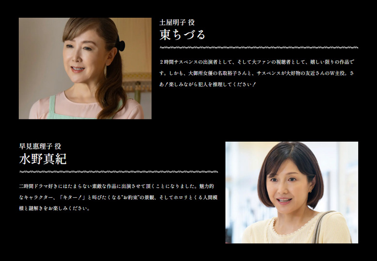 2時間サスペンスドラマの常連俳優が出ていますし、2時間サスペンスの定番でお約束といえるようなシーン(崖や崖や崖・・・)や流れが取り入れられていて、エンディングには、竹内まりやの「シングル・アゲイン」が流れ、「火曜サスペンス劇場」のエンディングを彷彿させらるところはとても懐かしくて良かったです。