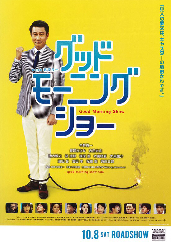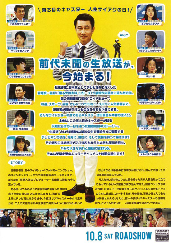 朝の情報番組「グッドモーニングショー」でメインキャスターを務める澄田真吾(中井貴一)は、起床して早々に妻・明美(吉田羊)と息子(弥尋)から、出勤途中には番組サブキャスターの小川圭子(長澤まさみ)から、それぞれ困った相談を持ちかけられる。さらに、プロデューサーからは番組の打ち切りを告げられて踏んだり蹴ったり。そんな時、都内のカフェで人質立てこもり事件が発生。「グッドモーニングショー」も事件をトップに生放送を開始する。しかし、ほどなくして警察から連絡が入り、犯人が「澄田を呼べ」と要求していると知らされる・・・ |
