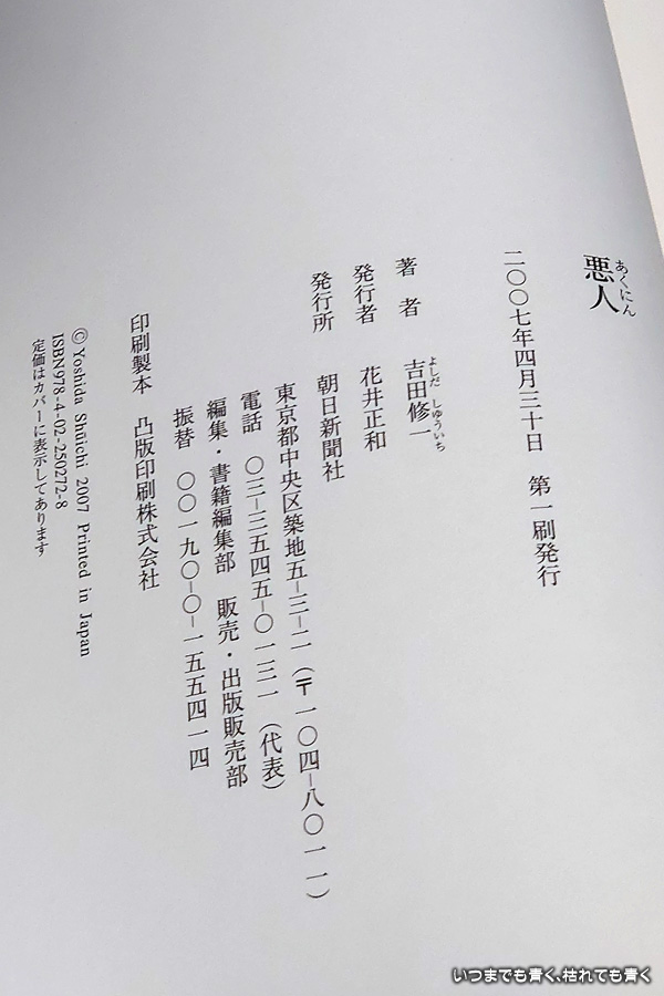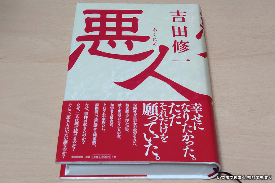 420ページの残りページが少なくなってきても、まったく「悪人」の気配すらありません。勘のいい読み手ならばその意味を少し前で気付きはじめるのかも知れませんが、私は最終ページの最後の行で、「悪人」というのをタイトルにしている理由がようやくわかったという次第です。この最終行をこういう形でさっと終わらせていることで、よけいにそのインパクトが強く感じられて、「そうか、やられた」という気持ちにさせられました。すばらしいエンディングだと思います。