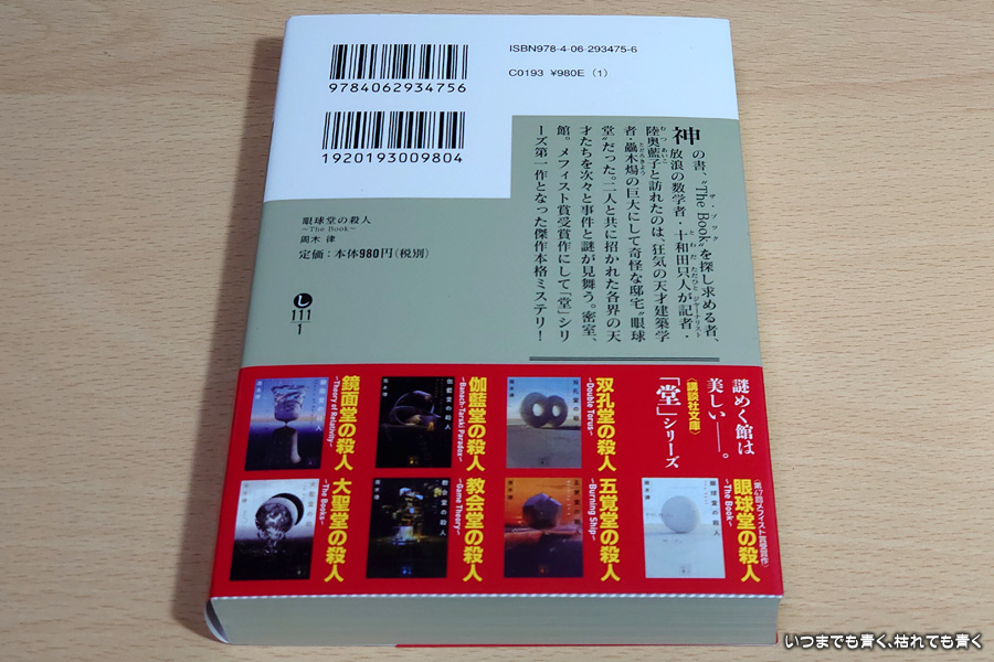 350ページを超える長編なので、一気に読み進めるのは難しいですが、場所が眼球堂だけであることと、時間の流れが明確なので話がややこしくなることはありません。時折、理解できない数学的な会話が入りますが、それを適当に流せば読みやすくて引き込まれる面白い作品でした。物語は藍子を中心に客観的に展開されます。読みながら犯人を自分なりに想像するのですが、藍子の「真実」という言葉に続く文章が意味深なのと、たまに不思議な心の動きが表現されているので、犯人は藍子ではないかと思いながら読み進めるのですが、藍子が犯人ならばどうしても説明できないことも多く、断定するまでにはいきません。そして最後は、眼球堂の仕掛けにによって、すべて驫木の犯行だったということが理論的に明らかにされて物語は終わり、藍子に対する違和感は逆の意味でのひっかけだったのかと騙された感を感じます。しかし、実は読者(私)が読んでいたこの物語は、事件が起きていた時のリアルな描写ではなくて、事件後に藍子が書いたノンフィクション小説だったということで、やられたという驚きと二度目の騙された感を感じます。そして、その小説について十和田と藍子が話をするという場面で、すべての真実が明かされてるという、そういう面白い構成でした。
