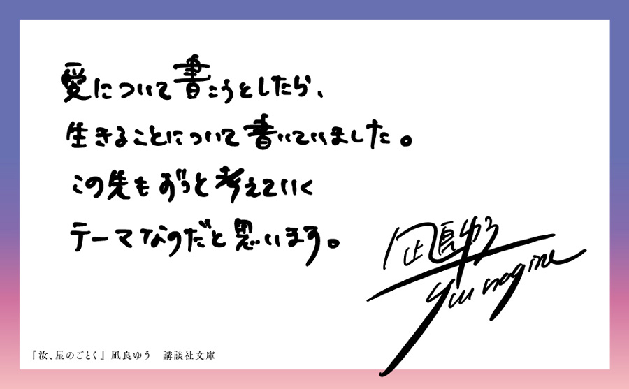 この作品も映画化されたら感動的かもと思っていたら、櫂が横浜流星、暁海が広瀬すずで来年公開されるらしいです。小説で感じた「櫂と暁海」と「横浜流星と広瀬すず」の印象とはちょっと異なりますが、横浜流星も広瀬すずも演技達者なので、いい映画になりそうです。瞳子と北原先生を誰が演じるのかも興味津々です。楽しみに待ちたいと思います。
