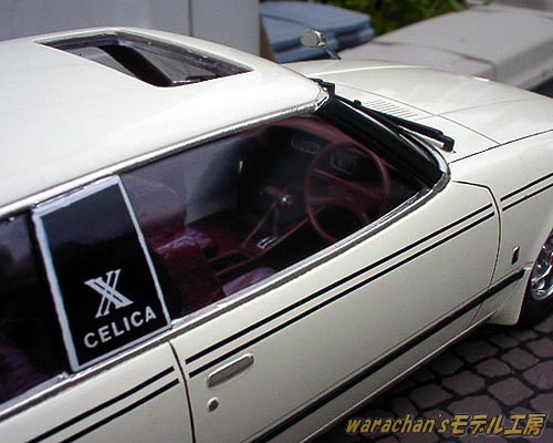 ただ、作品展に間に合わせるために、手のかかる作業はしていませんので、出来としてはいまいちでした。貴重なキットをこんな出来で組んでしまったのは少し悔いが残ります。ストライプは太すぎるし、XXの特徴のロングノーズもうまく表現できていません。(キット自体がセリカリフトバックと型を共有しているのでしょう) トレッドも狭くて不恰好です。