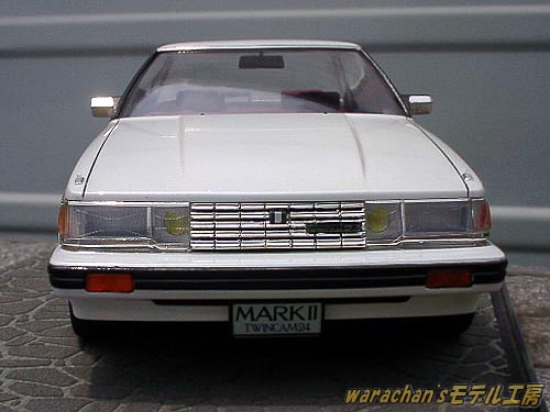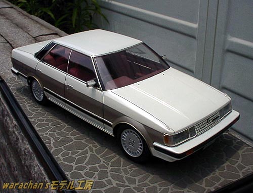 自分の愛車であるCAR-19クレスタを作成したので、1999年静岡ホビーショーはマークU系をテーマにしようと思い製作にあたったものです。ちょうど、キットも有井さんから再販(もともとはエルエス製)されたのでグッドタイミングでした。ただ、このキットのプラスチックは粘り気がある柔らかい品質で、ヤスリがけは少しやり難いです。色は、イメージカラーのツートンと決めたのですが、下半分の色は手に入らず、類似色を使っています。内装はこのころの豪華でけばけばしい雰囲気を出すため、シートはティシューを貼りこみ、色も明るいマルーンと少し暗いマルーンを使い分け、光があたっている部分とそうでない部分の赤みの違いを表現しました。ホールアーチも洋白線ですが、曲面に貼り付けるのは技がいります。 |
