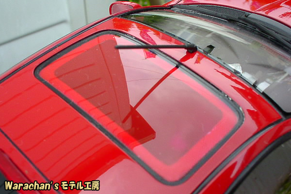 シートは単なる塗りわけだけでなく、赤の部分が角度によっては黒く見える雰囲気が出るように塗りました。サンルーフのガラス色もボディカラーをメッシュを介して裏から吹きつけドットプリントの雰囲気を出しています。