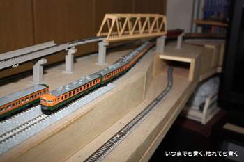 レイアウトの高低差をつけるという意味では別のことを考えています。オール高架で新幹線専用線路を作るつもりでいます。鉄橋などの情景はそちらで実現したいと考えています。ただ、線路スペースを優先にしたため、町や川を作る場所がないのだけは残念なのです。何かいい知恵はないものやらとずっと考えています。たぶん、今のままでは、運転は楽しめるものの、情景を楽しめるレイアウトにはならないと思っています。