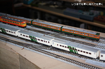 | この編成でも短く感じますので、そういう意味ではこのレイアウトは第一関門は無事に突破ということになります。もうしばらく試走を楽しんでから電気配線を考えたいと思います。 |