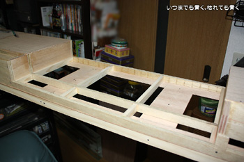 ようやく、川の部分の枠組みを作りベニヤ板を貼り付けたところまできました。