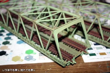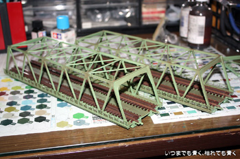 今日は、線路の正式敷設に向けて複線トラス鉄橋の塗装をおこないました。基本の色はもともとの整形色に似たライトグリーンとし、その上からサビや汚れを表現しました。あわせてレールのサビ塗装も同時にすませておきました。 |
